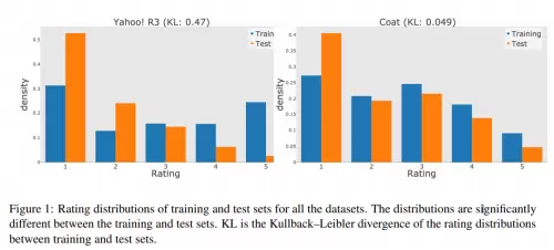 如下图所示,橙色表示来源于MNAR数据的用户评分分布,蓝色表示MAR的评分。可以看到,MNAR上用户的评分要大大偏高,多集中在5分,而MAR的数据较为平均的分布在1到5分之间。随着时间推进,MNAR的评分分布会越来越集中,加大和MAR评分的差距。
