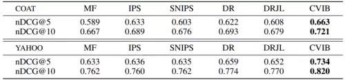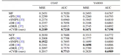 为验证其应用潜力,腾讯天衍实验室使用领域内的benchmark Yahoo R3! 和 Coat 公开数据集进行测试,使用MNAR的数据作为训练数据,使用MAR作为测试数据,从而能有效反映不同方法对于推荐模型的纠偏效果,最终实验结果如下表所示。