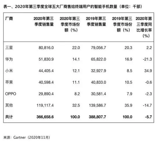 在排名前五的智能手机制造商中,三星以22%的市场占有率排名第一。小米以4440万部的销售量首次超过苹果位居第三,苹果在2020年第三季度的销售量为4050万部。
