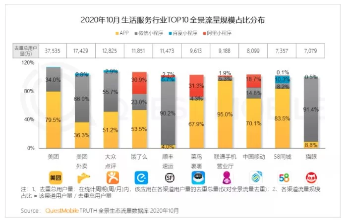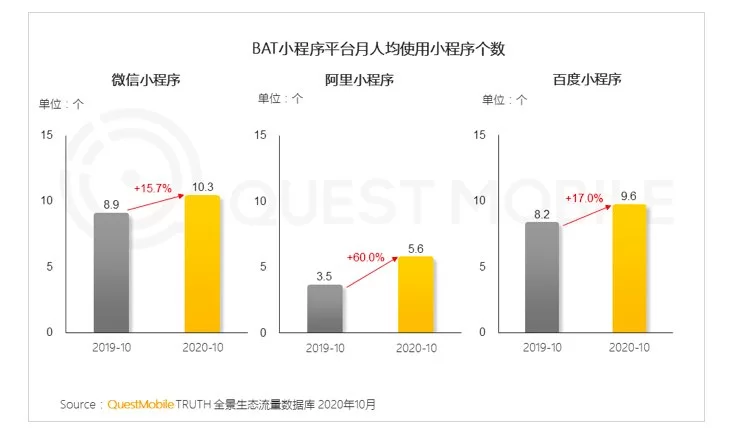 12月1日,Quest Mobile发布《2020全景生态流量秋季大报告》。报告显示,小程序正在改变商业和流量的新格局。其中,百度智能小程序月人均使用个数达到9.6个,稍落后微信,领先阿里小程序接近1倍。同时,在移动生态服务化战略的牵引下,百度智能小程序在外卖、快递等生活服务领域表现不俗,已成为人们获取生活相关服务的重要入口。