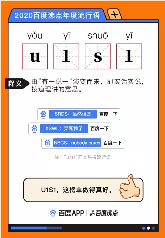 “u1s1”则是“有一说一”的简写,最初来自百度贴吧。在大家一起讨论的时候,先来一句“u1s1”,然后开始讲自己的观点,这样说话不仅能促进交流,还能让观点更加鲜明。甭管有没有依据,敢于“有一说一”的态度,这届网友就值得一个赞。