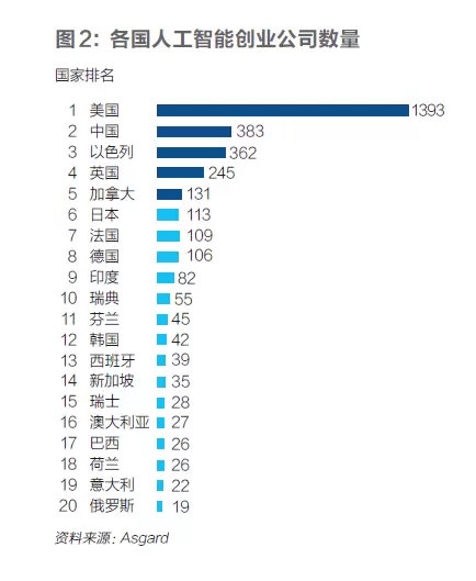 德国AI风投基金Asgard近期发布的报告显示,目前全球共涌现了3600余家AI创业公司,其中美国有1393家,占比40%;中国有383家,占比11%,以色列有362家,占比10%。