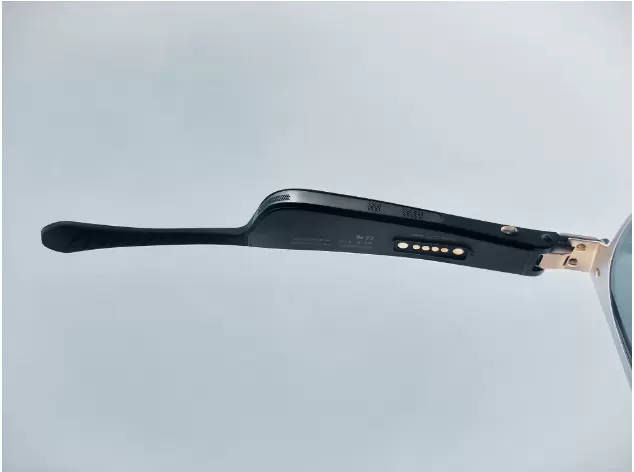 镜腿的下面集成了智能音频模块,从镜框往镜腿尾部依次为多功能按键和出音口,防水防尘网则位于镜腿中间的位置,而充电口设计在右腿的内侧。