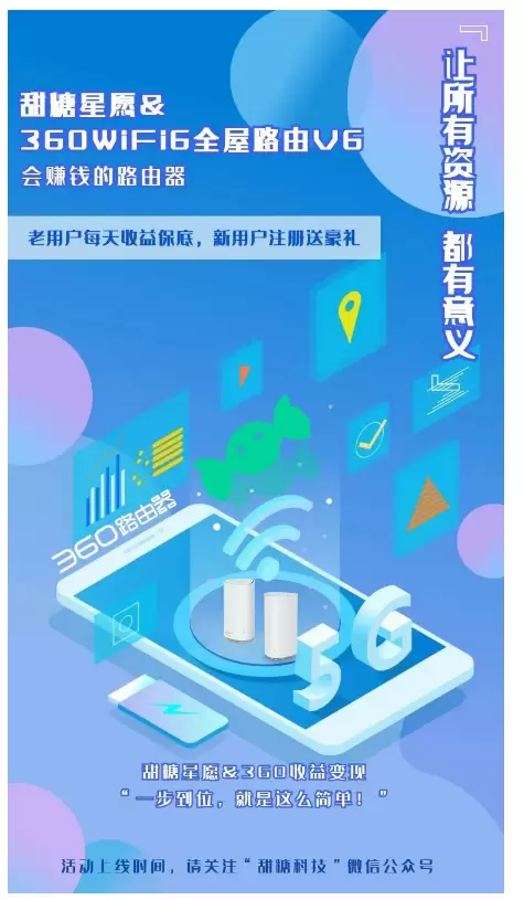 用户只需连接360 Wi-Fi 6全屋路由(需插上一个32G或以上的U盘设备)后,下载甜糖App,根据提示即可绑定设备,可以开通“分享闲置带宽”,根据每日贡献的闲置带宽赚取星愿积分。通常情况下,10M上行带宽最大可以得到2500星愿/月,40M上行带宽最大可以得到4000星愿/月,50M上行最大可以得到9000星愿/月。现在,关注“甜糖科技”微信公众号,可参与官方推出的绑定激活迎新奖励、手机绑定送电卡福利等多种优惠服务活动。