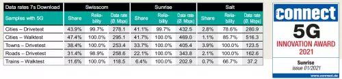 在瑞士的年度Connect移动网络测试中,顶尖的对手树立了最高水平的面对面对决的传统。两家领先的移动运营商在不同的类别中,可能得分会交换排名榜首的位置。在这次最新的测试中,Sunrise移动网络依然勇拔头筹:在5G网络方面,Sunrise获得了最快网络和最佳的网络连接;同时,Sunrise还提供了最好的4G和5G移动数据网络。在Connect的网络可靠性5个比拼类别中,Sunrise有 4个类别拿到了满分,同时平均速率达到了469Mbps,比亚军高59%,以绝对的领先优势被认为是最快、最可靠的5G网络。无独有偶,IHS Markit旗下的RootMetrics®最近的测试也表明了相同的情况:Sunrise拥有最快5G网络和最佳的网络连接。