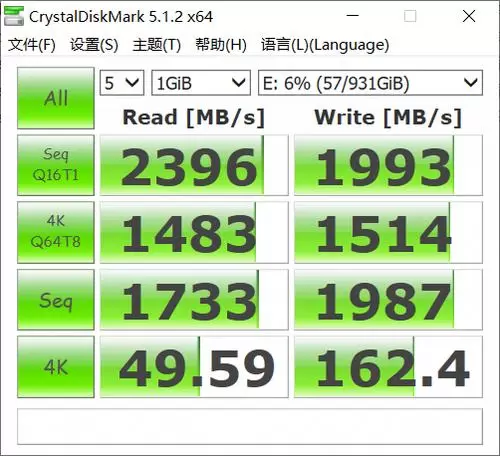 在CrystalDiskMark这款软件中闪迪至尊高速M.2 NVMe 3D固态硬盘跑分成绩,最终这款固态硬盘的顺序读取成绩为2396MB/S,和官方宣传的2400MB/S的速度一致,同时在顺序写入成绩方面,速度达到了1993MB/S,超过官方宣传的速度。