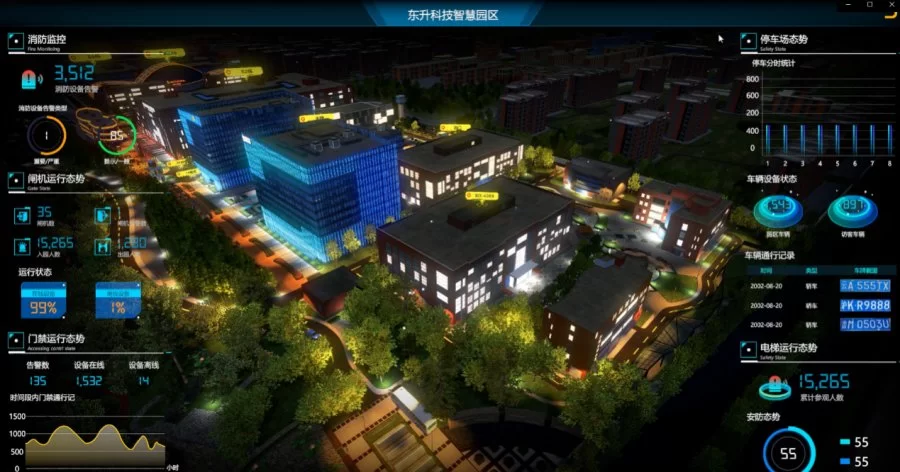 东升科技园是北京中关村区域引进先进科技园创办理念的示范园区。软通智慧打造的东升安防可视化系统通过3D可视化平台对接东升园区安防系统,结合GIS地图采用科技风格,可视化呈现园区内安防态势及趋势,为园区整体的安防状况提供直观的图表呈现,助力园区数字化管理、运营。