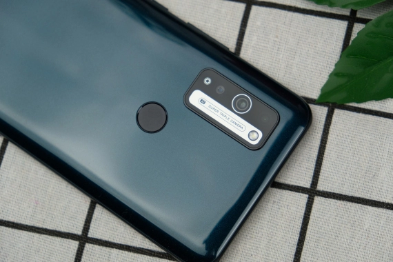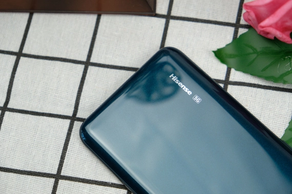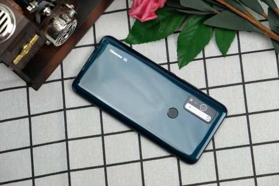机身背面,海信心意手机T50采用了四曲面机身设计,边角的弧度处理,使得握持感更为舒适。此次笔者拿到的是墨绿配色,虽然采用的是塑料机身,但通过工艺处理,实现了玻璃般质感。