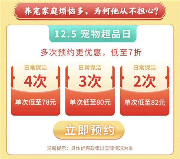 据58同城此前发布的家政市场报告,51.9%的家政服务消费者因养宠物而增加家政服务支出,宠物主人雇请保洁人员打扫房间,成为未来的家政服务的常态。针对爱宠用户的需求,在宠物超品日上,58同城到家精选推出特惠日常保洁服务,多次预约可享立减优惠。活动期间,原价110元的2小时日常保洁服务,预约两次服务仅需164元,单次服务价格降为82元。同时,随着预约次数增加优惠也不断加码,预约三次服务单次价格则低至80元,预约四次服务单次仅需78元。
