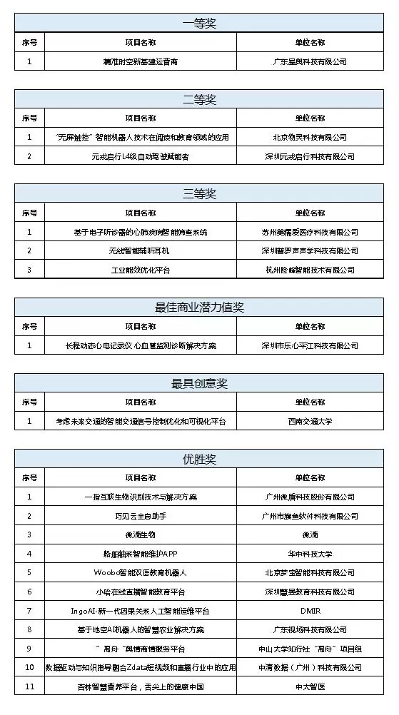 决赛获奖项目分别是:优胜奖获奖项目为广州微盾科技股份有限公司的一指互联生物识别技术与解决方案、广州市旗鱼软件科技有限公司的巧见云全息助手、微滴(厦门大学)的微滴生物、华中科技大学的船舶轴系智能维护APP、北京梦宝智能科技有限公司的Woobo智能双语教育机器人、深圳慧昱教育科技有限公司的小哈在线直播智能教育平台、DMIR(广东工业大学)的IngoAI-新一代因果关系人工智能运维平台、广东视场科技有限公司的基于地空AI机器人的智慧农业解决方案、中山大学知行社“禹舟”项目组的”禹舟“舆情商情服务平台、中清数据(广州)科技有限公司的数据驱动与知识指导融合Zdata短视频和直播行业中的应用、中大智医的杏林智慧营养平台-舌尖上的健康中国;最具创意奖获奖项目为西南交通大学的考虑未来交通的智能交通信号控制优化和可视化平台;最佳商业潜力值奖获奖项目为深圳市乐心平江科技有限公司的长程动态心电记录仪 心血管监测诊断解决方案;三等奖获奖项目依次为苏州美糯爱医疗科技有限公司的基于电子听诊器的心肺疾病智能筛查系统、深圳普罗声声学科技有限公司的无线智能辅听耳机 、杭州险峰智能技术有限公司的工业能效优化平台;二等奖获奖项目为北京物灵科技有限公司的“无屏触控”智能机器人技术在阅读和教育领域的应用、深圳元戎启行科技有限公司的元戎启行L4级自动驾驶赋能者;一等奖获奖项目为广东星舆科技有限公司的精准时空新基建运营商。