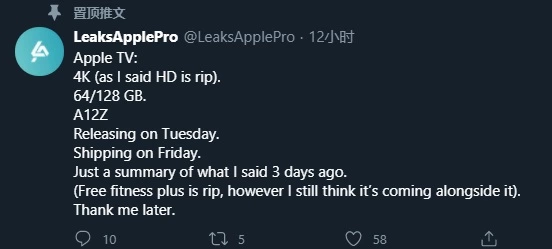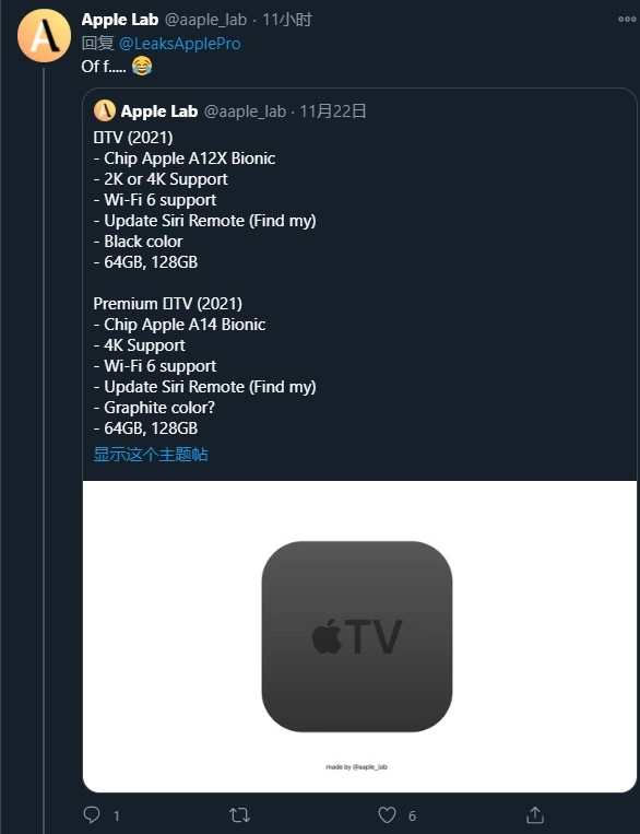值得一提的是,知名爆料者 @Apple Lab 表示他已经在上个月放出了类似内容,而且他认为 Apple TV 将提供一款 Premium Apple TV 版本,升级为 A14 芯片。