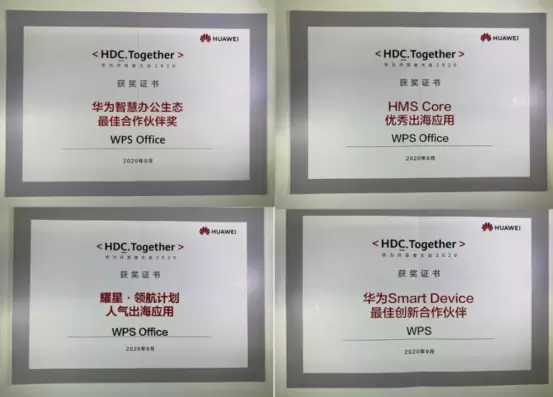 2020 年9月10日的华为开发者大会上,华为重磅推出 HarmonyOS 2.0 版本。金山办公此次参加了此次论坛,并带来《基于分布式能力构建未来办公新体验》的主题分享,同时斩获“HDC 2020最佳合作伙伴”、“华为智慧办公生态最佳合作伙伴奖”、“HMS Core优秀出海应用”、“耀星·领航计划人气出海应用”、“华为Smart Device最佳创新合作伙伴”等六项大奖。