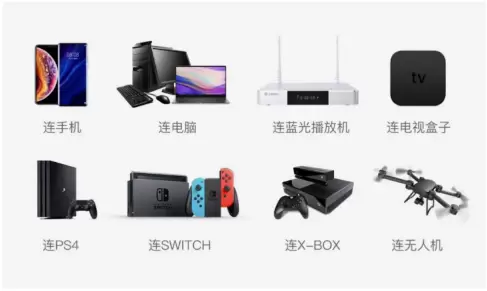 对于不具备HDMI功能接口的设备,其实借助一个HDMI转换器也能实现连接,除此外还能够借助无线投屏的方式同样可以让画面呈现在设备里,飞无人机、玩Switch、X-BOX等游戏设备都完全满足。虽然它不能像VR设备那样360度完全画面的包裹,但是能将手机、电脑等设备的画面投放出800寸巨幕视效之后依然能够保持影片画面不出现畸变、显示效果依然清晰细腻,这也是VR产品与很多头戴影院所不能实现的。