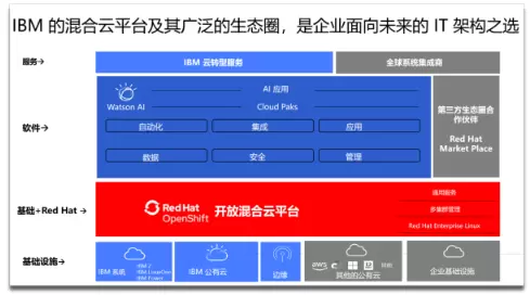 这张图分为四层,有红、蓝、灰三个色块,完整说明了IBM悠长辉煌的历史和现在宏大的计划。今年四月Arvind Krishna 接任 IBM CEO 提出,IBM的战略简单而清晰,就是要打造一个贯穿企业级AI能力的开放的混合云平台,在IBM我们称之为第四平台。IBM在历史上已经成功打造了三个平台,图上的蓝色块就是IBM前三个平台所积累的宝贵资产和能力;中间的红色是我们去年收购的红帽 OpenShift,这是业界最领先的企业开源技术和多云容器平台;灰色是跨越整个平台全堆栈的各种类型的生态合作伙伴,IBM正在携手这些生态合作伙伴,一起推进基于我们混合云平台的新产品和新解决方案的构建和落地。