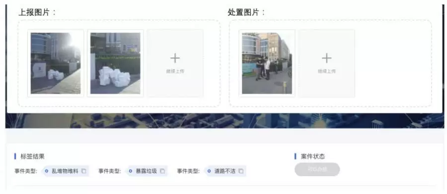 在结案端,AI 化身结案审核小助手,基于上报图和结案图,采用相似度模型自动判断上报图与结案图是否是同一场景,再结合事/部件识别结果判断问题是否解决并给出 AI 结案意见,帮助坐席更快、更高效地审核案件,解决案件结案归档不及时,人员前往现场反复核查的问题。