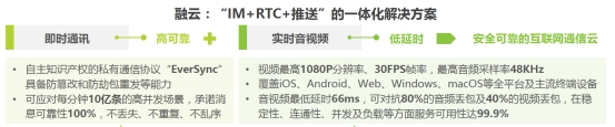 如果分别从 IM 和实时音视频领域看,融云领先优势明显。根据艾瑞报告数据,融云已经连续第六年领跑IM市场,覆盖的 APP 日活设备数加总(非去重)超过 5000 万台,居国内第三方厂商的首位。融云 IM 拥有自主知识产权的私有通信协议“EverSync”,具备防篡改和防劫包重发等能力,可应对每分钟 10 亿条的高并发场景,承诺消息可靠性 100%,不丢失、不重复、不乱序。