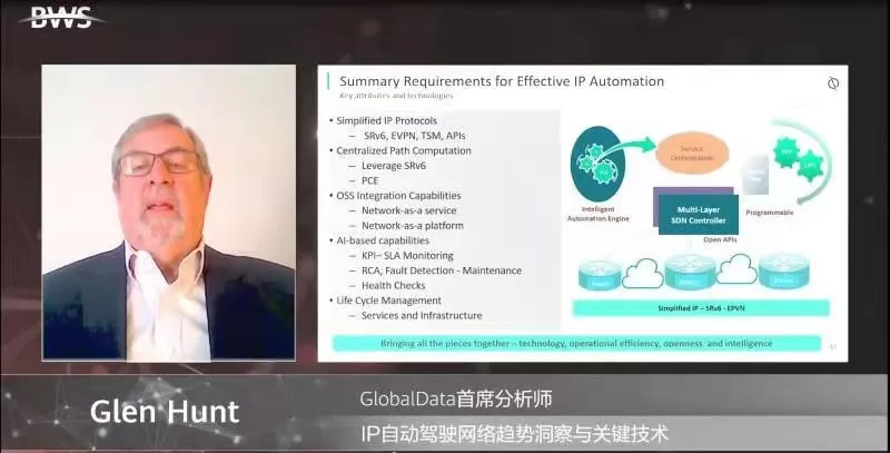 在12月10日-11日举行的“共赢未来全球线上峰会”上,国际著名数据分析与咨询公司GlobalData的首席分析师Glen Hunt发表了专题演讲,详细介绍了自动驾驶网络的机会点、产业进展、全球领先运营商的用例,并从分析师视角对使能自动驾驶IP网络的关键技术做了解读。