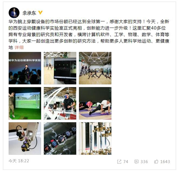 12月10日晚间消息,华为消费者业务CEO余承东在其个人微博上表示,华为腕上穿戴设备的市场份额已经达到全球第一,感谢大家的支持。未来将携手华为在全球与本地的运动健康创新能力,打造一个创新、领先、开放的华为运动健康生态圈。