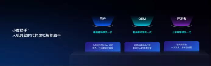 对于OEM而言,小度助手将提供领先一代的商业模式,让运营变成可以快速运转的赚钱机器,将车联网从成本中心直接变成利润中心,并打造“会呼吸、有生命、可进化”的⻋载体验,帮助OEM伙伴业务持续升级。不仅如此,小度助手还将通过高度集成的新运营⼯具集,赋能车企全周期用户运营。