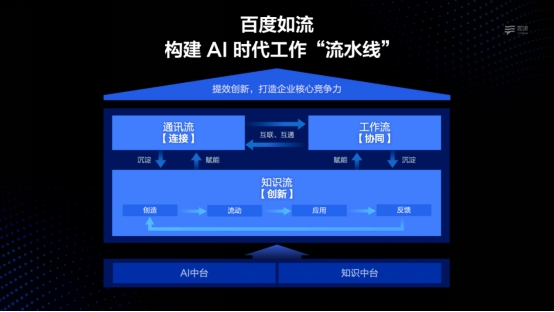 贺锋出席了下午的新一代数字化企业分论坛,并表示,“百度致力于建设以知识管理为核心的智能工作平台,通过线上化、智能化,提升效率、加速创新,具体支撑则为‘流水线’中的通讯流、工作流、知识流。”