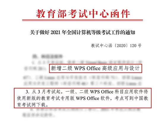 2020年11月25日,国家教育部考试中心宣布:将新增计算机考试科目,正式把使用最广泛的国产办公软件——WPS Office作为全国计算机等级考试(NCRE)的二级考试科目之一,该调整计划明年在全国实施,3月正式开考。