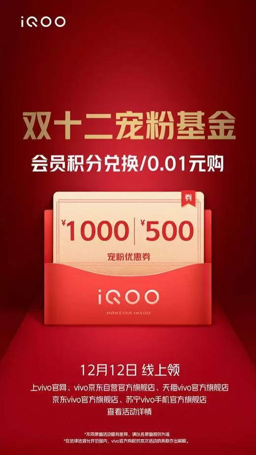 此次的“年终宠粉盛典”还提供了“双十二宠粉基金”,用户可以通过会员积分兑换、0.01元购、0元抢等多重方式得到1000元与500的宠粉优惠券。12月12日当天将在vivo官网/京东/天猫/苏宁官方店铺同步开启,感兴趣的朋友千万不要错过。
