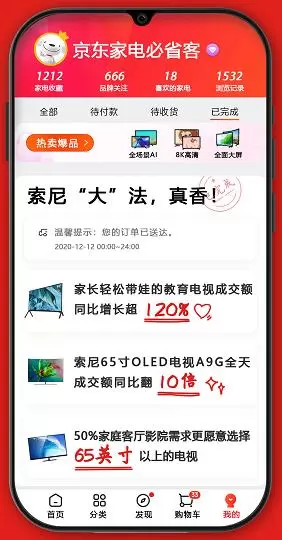 电视出圈教育界,"寓教""娱乐"一屏搞定。论现在的家长有多难,不按套路出的小学题也有可能难倒研究生。京东家电12.12销售数据显示,有海量教学内容、能让家长轻松带娃的教育电视成交额同比增长超120%。同时,作为客厅娱乐的首选,50%家庭为打造客厅影院更愿意选择65英寸以上的电视,一款索尼65英寸OLED电视A9G全天成交额同比翻10倍。能学能玩能做一切的新时代电视,正在重新成为客厅的"主角"。