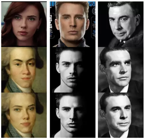 (人脸形象替换示例,每列依次为换脸,换妆,光照控制效果)
