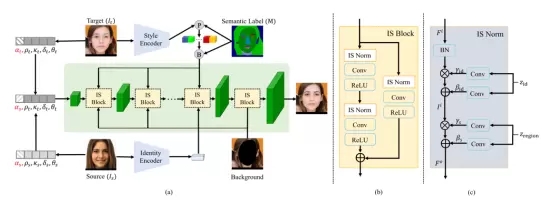 为保障视频人脸融合输出的高质量与高保真度,百度团队设计了Identity-Style Normalization Module框架,可利用身份信息和区域纹理编码对主干生成网络特征进行调制,使得视频源的身份和区域纹理信息得到最大化的保留,在“换脸”时让观众很难分辨出差异。同时,该产品利用一个简单的前向模型来实现,仅用单图就能对视频进行换脸,数据效率更高。