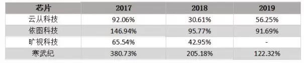 从公司规模看,云从科技研发支出4.54亿元,对应技术人员为872人。从收入占比来看,2018年和2019年云从科技研发投入占比分别为30.61%和56.25%,在研发人员和研发投入相对旷视、依图较少的情况下做到了不错的营收与增速。