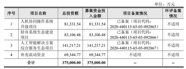 此次上市,云从科技拟募集37.5亿元,用于人机协同操作系统升级项目,轻舟系统生态建设项目和人工智能解决方案综合服务生态项目。
