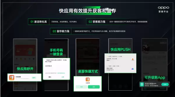 快应用作为终端媒体特有的应用场景,具备无需安装、即点即用的特性,能够在广告投放和业务转化流程中有效提升效率。例如,快应用可以点击即激活,省去下载和安装的流程。另外还可以支持创建桌面快捷方式,并可以在后续升级为App,完成转化。为了帮助客户快速迁移,平台还支持使用迁移工具从小程序零成本直接转移,降低营销成本。