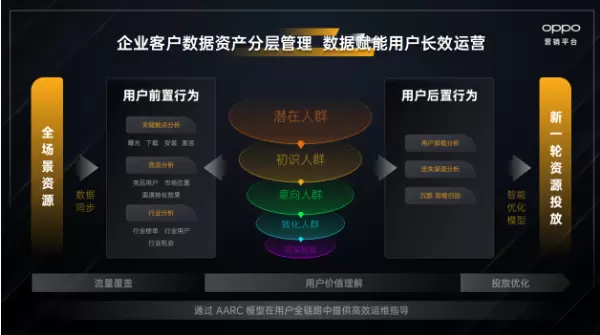 首先,在寻找目标受众方面,Accurate(精准触达)是OPPO营销利用终端媒体系统优势所构建的底层能力。在移动互联网时代,终端媒体是信息与数据的海洋,其能够打破App数据孤岛,提供跨App的数据能力,并洞察用户在系统中的搜索行为及意图,在深度和广度上同时提供精准的触达能力。有了众多的用户数据来源后,经过DataMiner智能大脑的整合,OPPO营销构建了丰富的标签系统和人群画像,从而应用在客户的预算分配、人群圈取、相似人群拓展等的场景,精准地指导广告主决策。同时,基于AARC模型,对企业客户的数据资产进行分层管理,帮助客户进行数据运营分析,做出更科学的营销决策,赋能用户长效运营。