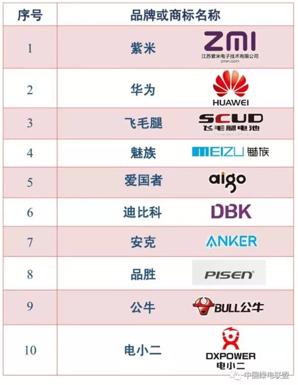 《中国绿电联盟》报道可这一消息。这个名单上共包含10家企业,分别为:紫米、华为、飞毛腿、魅族、爱国者、迪比科、安克、品胜、公牛以及电小二(排名不分先后)。
