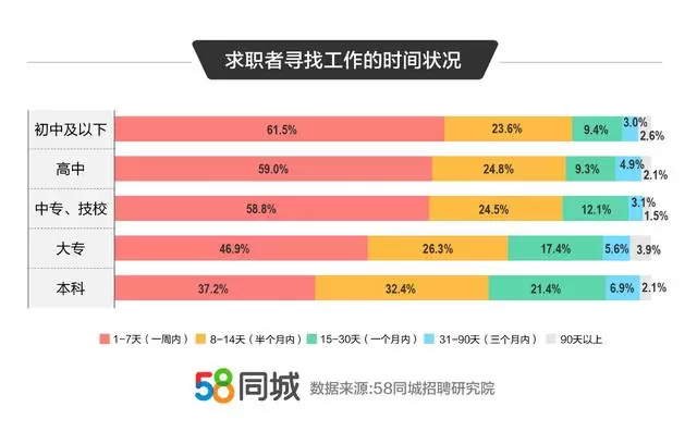 58同城招聘研究院数据还显示,学历与求职者择业花费时间有相关性,61.5%的初中及以下学历求职者在一周内就可找到工作,而本科生在一周内找到工作的占比仅为37.2%。这一定程度上表明,充足的基层岗位为基础职位求职者带来了丰富的就业机会,而高学历求职者择业更为慎重,选择周期较长。