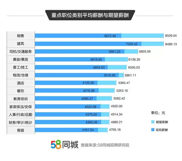 58同城《2020年求职者调研报告》显示,销售类岗位期望薪资排名第一,达到8509元/月,但实际企业支付月薪为5642元;而物流/仓储岗位期望薪资与实际月薪的差值仅为345元,达到5516元。企业支付薪资最高的行业为建筑业,达到7025元/月,其次是司机/交通服务类职位,为5901元/月。可见,尽管销售是求职者心目中的"高薪酬"职业,但获得实际高薪还需付出脚踏实地的努力。