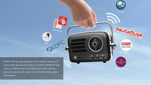 该产品可一键切换 Wi-Fi 网络与 5G/4G 网络的连接,同时根据网络情况兼容 3G 自适应匹配音频质量,摆脱了传统收音机无线电波不足和传统蓝牙音箱连接距离过短的束缚,实现脱离手机独立工作,打破地域限制,随时随地收听到全球范围内的优秀电台节目及音频内容。