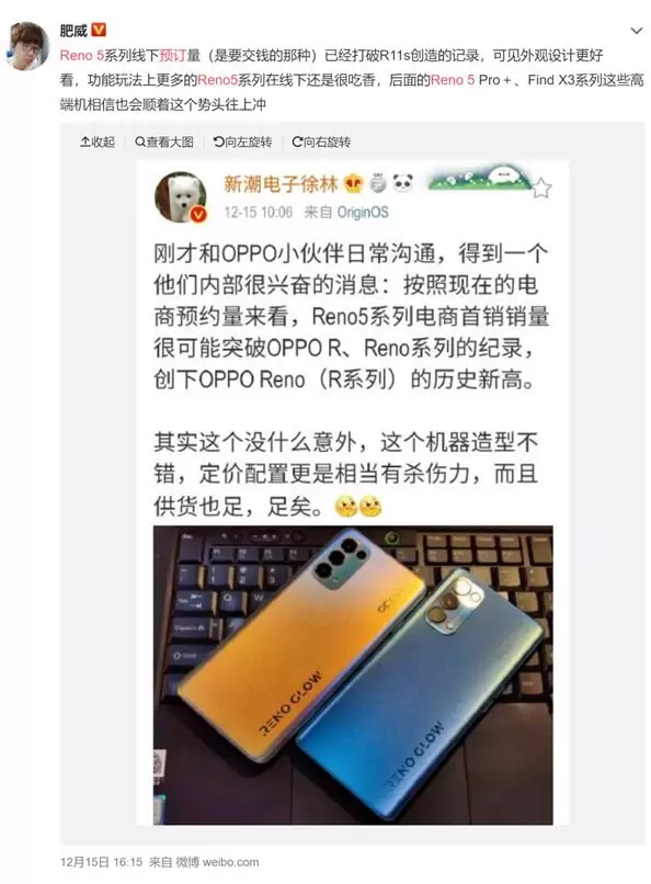 据微博用户爆料,Reno5系列线下预订量已经打破R11s创造的记录,看来12月18日首销当天很有可能打破此前R系列保持的首销记录。凭借几代产品在视频、设计、体验上的持续进步,Reno系列已经赢得用户的认可。