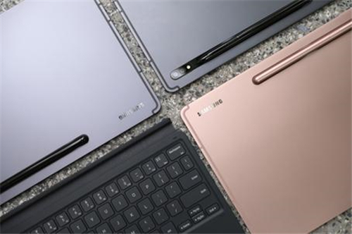 从外观上看,三星Galaxy Tab S7|S7+拥有四边等宽的对称式全面屏设计,Galaxy Tab S7屏幕尺寸为11英寸,Galaxy Tab S7+则相对较大,为12.4英寸屏幕。超窄边框的带来了极高的屏占比,这使得三星Galaxy Tab S7|S7+在拥有超大屏幕的情况下仍能拥有近似真实笔记本的体积,金属机身简洁且优雅,曜岩黑、冷山灰和迷雾金三种配色呈现出迷人的格调,拿在手中宛如一本精美的手账。