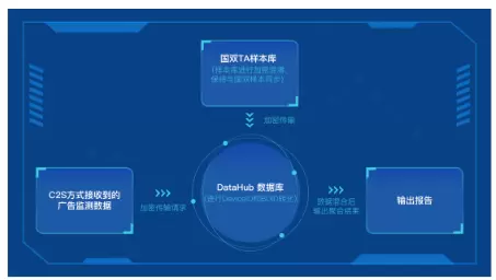 此解决方案的具体实施方式是,国双将通过C2S方式接收到的广告监测数据和国双TA样本库,分别加密传输至 DataHub,DataHub按照国双要求的方式进行计算,完成计算后输出聚合性结果,国双经过再次校验、整合,最终输出报告。