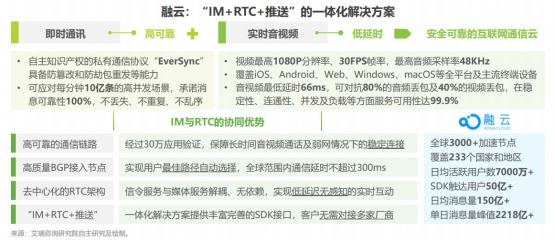 在近期艾瑞咨询的《2020年全球互联网通信云行业研究报告》中,全球互联网通信云领先厂商——融云再次入选报告。作为较早从事第三方互联网通信云的PaaS厂商,融云在IM领域市场占有率多年保持第一,在实时音视频领域,因推出“IM即时通讯+RTC实时音视频+Push推送”的整体通信解决方案,以一体化的技术服务优势构成竞争壁垒,成为互联网通信云头部的基础能力提供商。