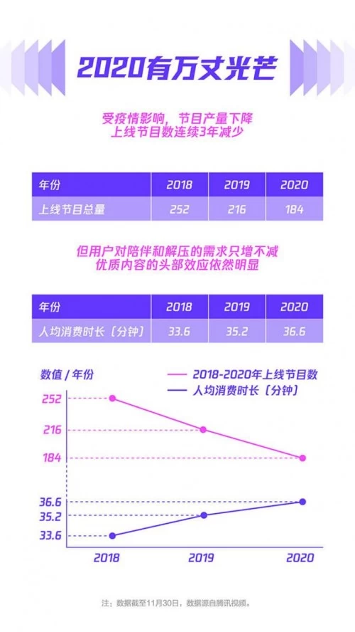 受疫情影响,2020年综艺节目线下录制限制增加,节目产量出现明显下降。报告显示,腾讯视频2020年上线节目数184档,较2019年减少32档。在行业整体延续量降质升的大趋势下,节目人均消费时长由去年的35.19分钟增长至今年的36.08分钟,用户对陪伴和解压的需求只增不减,优质内容的头部效应依旧明显。