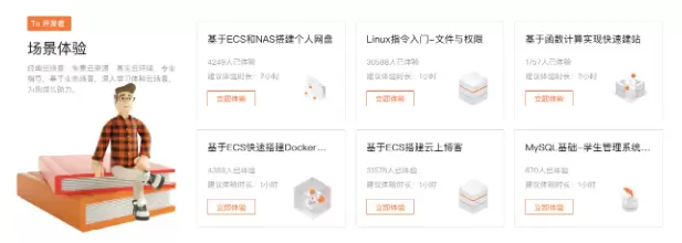 以开发者爆款机型做支撑,开发者在平台中能够获取真实云环境,在专业指导下基于业务场景深入体验云场景。例如:基于ECS搭建云上博客、基于函数计算实现快速建站等业务场景均可在线体验实操。