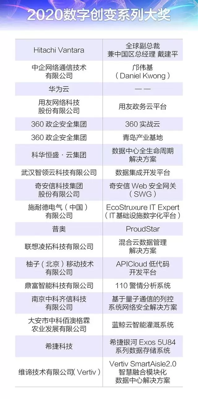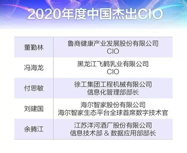 与本届“中国优秀CIO高峰论坛”同期举办的还有“2020年度中国优秀CIO颁奖典礼”。评选活动历时数月,经海选、复选、入围、评审四个阶段,由往届杰出CIO代表、行业专家和权威专家评委对来自各行业的入围名单进行投票评审,综合各方投票及评审结果,最终评选出“2020数字创变系列大奖”0“2020年度区域数字化贡献奖”“2020年度中国杰出数字化团队”“2020年度中国杰出数字化项目”“2020年度中国优秀CIO”,以及五位“2020年度中国杰出CIO”。