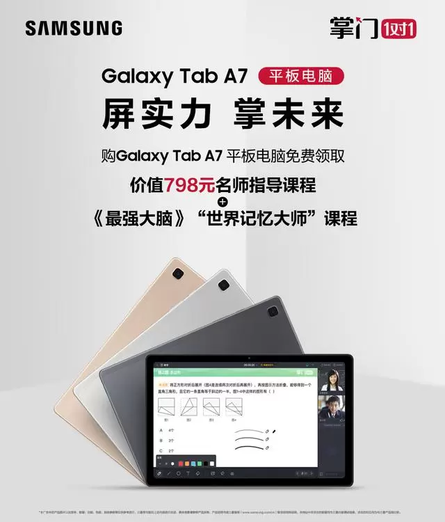 转眼岁末,对学生来说,最重要的事莫过于期末考试和寒假,各地区的寒假安排也已经出炉:和往年相比,由于疫情原因,各校寒假时间都有延长。长假即将开始,如何科学地使用学习工具并制定合理的学习计划成了学生们必须要提前考虑好的问题。为此,三星电子携手在线教育品牌掌门1对1早早地做好了规划,2020年12月21日起至2021年03月31日,凡在三星官方网上商城、京东、天猫、苏宁易购等线上渠道购买三星Galaxy Tab A7即可获得价值798元精品课程大礼包。