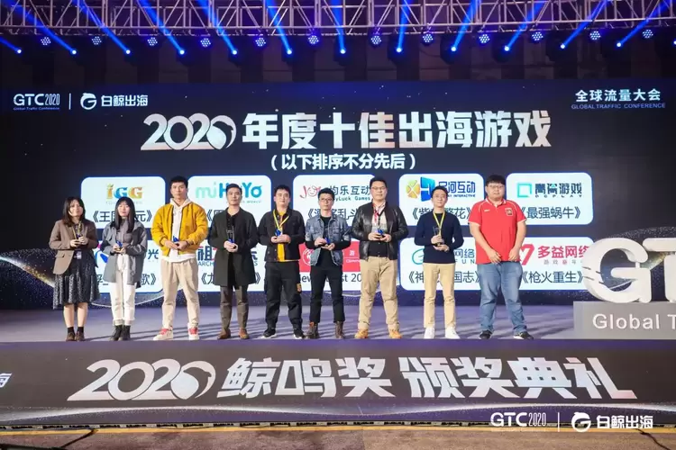 随后,颁奖典礼正式开始,揭晓了本届“鲸鸣奖”全部获奖名单,包含2020年度十佳出海游戏、2020年度十佳出海游戏发行商、2020年度十佳出海文娱APP、2020年度十佳新锐出海企业、2020年度十佳出海品牌、2020年度十佳海外营销服务商、2020年度十佳出海服务商、2020年度优秀出海领军人物在内的8个奖项,现场共颁发了75座奖杯。