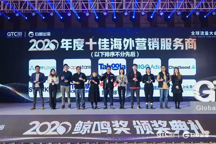 2020年度十佳海外营销服务商奖项获得者有:Taboola、Chartboost、BIGO Ads、猎豹移动、YinoLink易诺、点摩科技、Appstare、SparkX邑炎科技、LinkedIn、AppLovin。