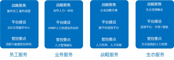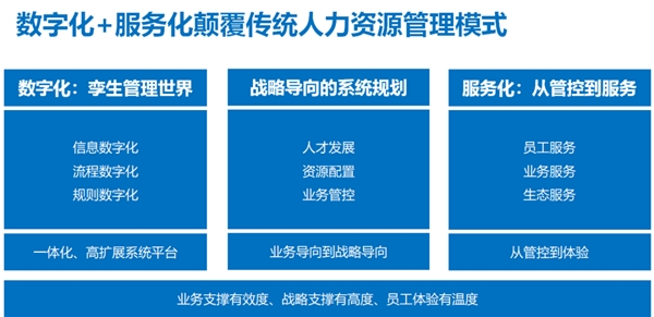 有人说数字化就是说数据化、系统化、信息化。简单解释就是数字化要孪生管理世界,对于线下的任务怎么管就应该怎么把它数字化,数字化是管理当中的一个部分,它跟实际业务相辅相成,通过数字化孪生管理世界。基于战略导向的系统规划,核心关注人才发展、资源配置、业务管控。第二就是服务化,以前人力资源主要是做相应的管控,现在是从管控到服务,怎么更好地服务员工、怎么更好服务业务、怎么更好地服务好生态。因为在人力资源领域发生很大的变化,就是灵活用工,企业里的用工类型不再仅仅只是我们的正式员工,也不再是一些劳务派遣,企业会有很多的用工类型,这是一种生态。但是管理是一样的,只是基于成本的不同,有了不同的用工类型。但是实际上目前在企业里面,对不同用工类型的员工的管理越来越趋于一致,在这种情况下,怎么更好地做好这种生态的服务,就是从管控到体验的变革。所以对人力资源数字化平台的要求就要做到业务支撑上有效度,战略支撑上有高度,员工体验上有温度的数字化的平台。
