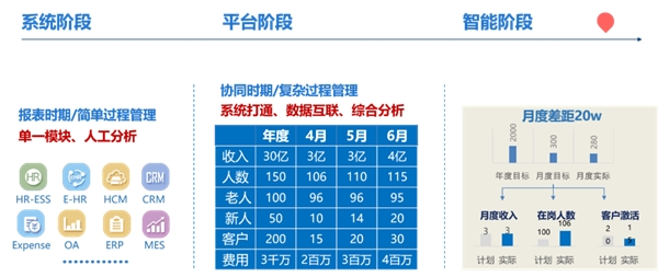 第一个阶段是系统化阶段,首先企业会考虑上一套人力资源系统,无论是综合的人力资源系统,还是聚焦在单一模块的人力资源系统,这是解决企业简单的数据方面的问题。第二个阶段是平台阶段,是解决系统之间协同数据互联的这样一个过程。第三个阶段是一个智能的阶段,需要考虑怎么去用好已有的人力资源大数据。起初企业人力资源系统建设的时候,一般基于最初的希望,其实初期使用还是可以,但是用着用着就没有用起来了。现阶段,人力资源数字化经历了一个过程,现在已不再需要去普及是否需要应用一套人力资源系统,因为人力资源数字化平台已经是一个从无到有,再从有到优的这样一个过程。