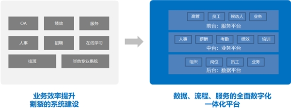 二企业人力资源数字化的转型第一个趋势体现在对人力资源数字化的需求上。从业务需求驱动到业务数字化驱动,早期的需求是希望通过人力资源系统提高某个业务的效率,如招聘系统、考勤系统等,每个模块是割裂的,更多地是解决单一业务层面的一个效率问题。但是随着业务的深入,其实我们会发现,人力资源管理系统应该是基于整体的一个业务,因为人力资源的业务它都不是一个单一的领域。比如说一个员工的入职,不仅仅是关注招聘环节,可能更多地也会去关注他招聘到入职之后的一系列的全生命周期的发展。比如,员工发生了调动,请问他仅仅只是一个人事上的动作吗?不是的,员工发生调动之后薪酬怎么变、考勤怎么变、绩效怎么变、培训怎么做对应,它是一系列的。所以说新一代的数字化需求是基于数据、流程、服务全面的一体化的平台,系统需要一个强大的数据后台,去做好技术稳定的管理,通过中台去做好协同的业务,通过服务去满足不同角色的体验的需求,这是第一个人力资源数字化的趋势。